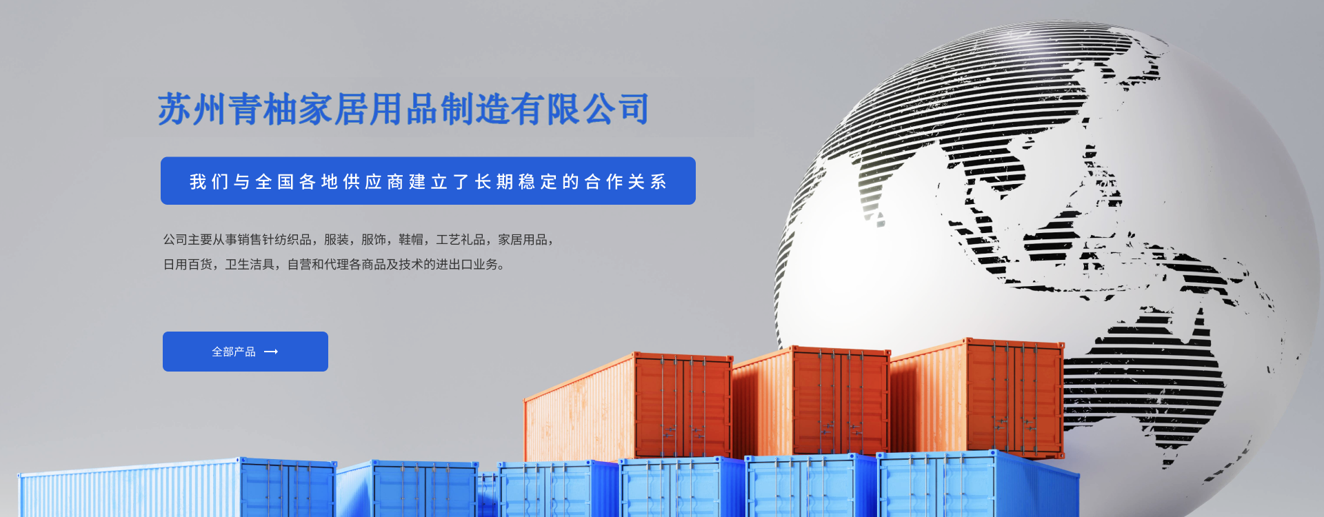 蘇州青柚家居用品制造有限公司,主要從事銷售針紡織品,服裝,服飾,鞋帽,工藝禮品,家居用品,日用百貨,衛(wèi)生潔具,自營和代理各商品及技術(shù)的進(jìn)出口業(yè)務(wù)。公司與全國各地供應(yīng)商建立了長期穩(wěn)定的合作關(guān)系。為了提供更好的品質(zhì)與服務(wù),旗下設(shè)立了倉儲,檢品,檢驗,包裝為一體的公司,確保質(zhì)量的同時能夠按時交貨。